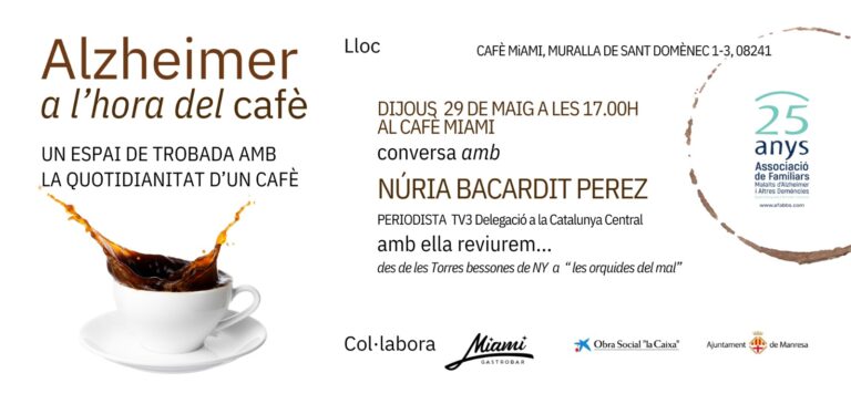 El proper dijous, la nostra convidada a les trobades ” ALZHEIMER A L’HORA DEL CAFÈ” és la periodista i escriptora NÚRIA BACARDIT, responsable de la delegació de Tv3 a la Catalunya Central. Acostumada a explicar les històries on els protagonistes son sempre els altres, serà un plaer conversa amb ella