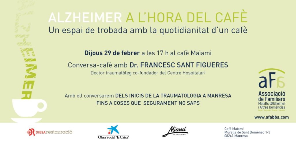 El convidat del nostre pròxim “Alzheimer a l’hora del cafè” és el Dr. Francesc Sant Figueres. Traumatòleg i cofundador del Centre Hospitalari. Que no és poca cosa. Serà un cafè per recordar i descobrir un munt de coses vinculades a la sanitat a la nostra ciutat. El Dr. És un pou de saviesa i serà un plaer escoltar-lo. Us hi esperem a tots/es!!