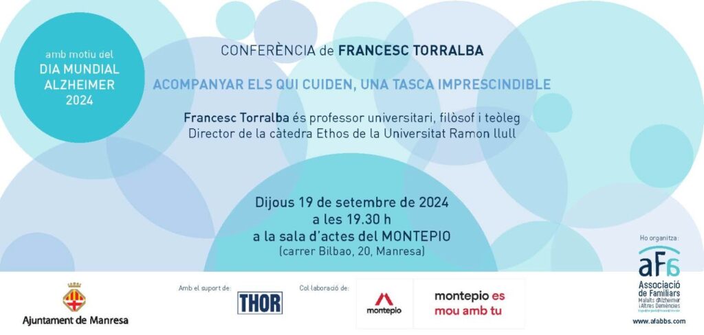 Qui cuida els cuidadors? No és una pregunta retòrica o una frase feta. Forma part de les nostres línies de treball com a Associació. Al costat de l’evident – i imprescindible – atenció a les persones amb Alzheimer hi ha sempre present la figura de l’acompanyant. Indispensable. La parella, la mare, el pare, els fills, el conjunt de la família esdevén, en cada cas, l’art de “ protecció” i acompanyament de la persona amb Alzheimer. I el cuidador és una figura potentíssima, insubstituïble, que sembla forjat d’una força i un coratge difícils d’intuir abans d’haver d’enfrontar-se amb els estralls de la malaltia. Per això en aquesta celebració de 2024 en motiu, del Dia Mundial d’Alzheimer hem volgut posar l’atenció, el focus, la mirada en els cuidadors. Tan potents i tan fràgils alhora. I per fer-ho comptem amb una figura de pensament de primer ordre com és en FRANCESC TORRALBA. Professor universitari, filòsof i escriptor amb un amplíssim bagatge de coneixement , reflexió i amb aquella capacitat de, amb un discurs d’alt nivell i summament entenedor i humà fer-nos pensar, entendre i empatitzar en aquest cas en la figura del cuidador i la necessitat de cuidar-lo i acompanyar-lo. Serà un plaer aprendre.