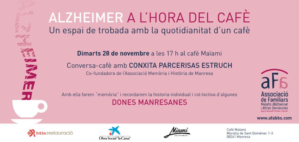 Dimarts dia 28 de novembre fem un cafè que ens ha fet molta il·lusió. Per qui és la convidada Conxita Parcerisas i per l’entitat on ella fa molta feina… Memòria històrica de Manresa. Hem compartit conversa i cafè amb Conxita Parcerisas Estruch, com sempre al cafè Miami de Manresa, i parlar amb ella és parlar de memòria. Cofundadora de l’Associació memòria i història de Manresa, la seva ingent tasca de recupera memòria entronca emocionalment amb la nostra causa. Per això va ser un goig escoltar-la compartint trossos de vida i fets de manresans i manresanes que sense la recerca d’historiadors com ella ara romandrien en l’oblit més absolut. Especialment bonic, i merescut, va ser el record que ens va tornar de “manresanes que han fet història” valorant el perfil de dones que formen, o hauria de formar part, del nostre record històric. La seva mirada enrere ens interpel·la oi? Recuperar la memòria no és només recuperar el passat, és donar més sentit al nostre present. Gràcies, Conxita. En trobareu més info a www.memoria.cat